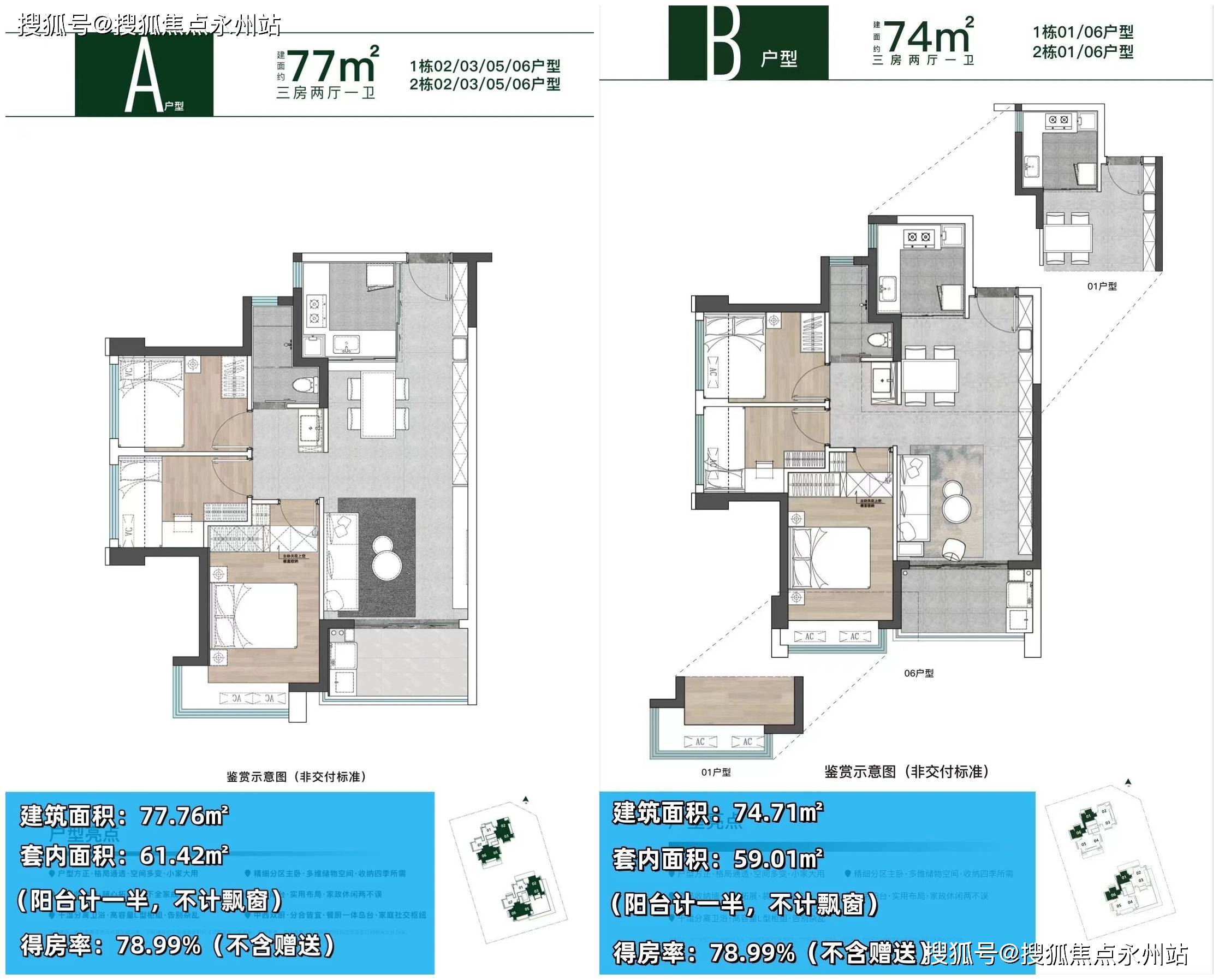 77㎡的3房2厅1卫:设计的是竖厅格局,客餐厅一体化,L型厨房,卫生间三段式分离设计,整体的户型格局对比74㎡差异不大,得房率:78.99%(不含赠送),02.03户型,东北朝向,04.05户型,东南朝向。