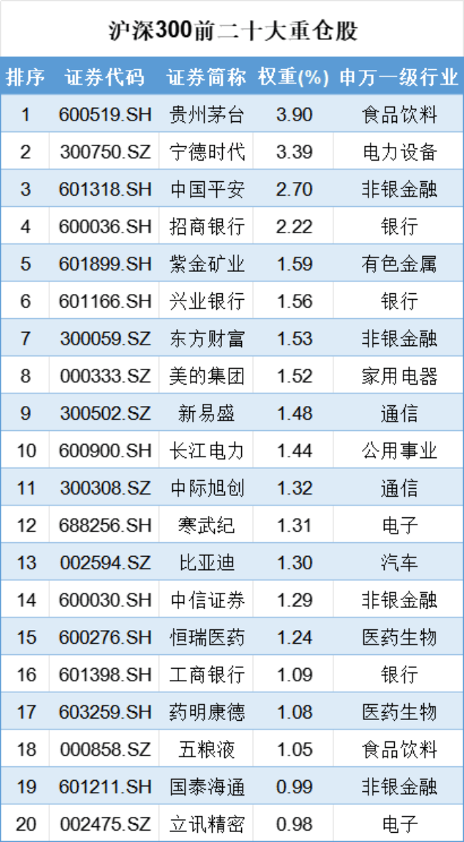 目前沪深300指数前十大权重股分别为贵州茅台、宁德时代、中国平安、招商银行、紫金矿业、兴业银行、东方财富、美的集团、新易盛、长江电力,前十大权重股合计占比超20%,前二十大权重股合计占比超30%。