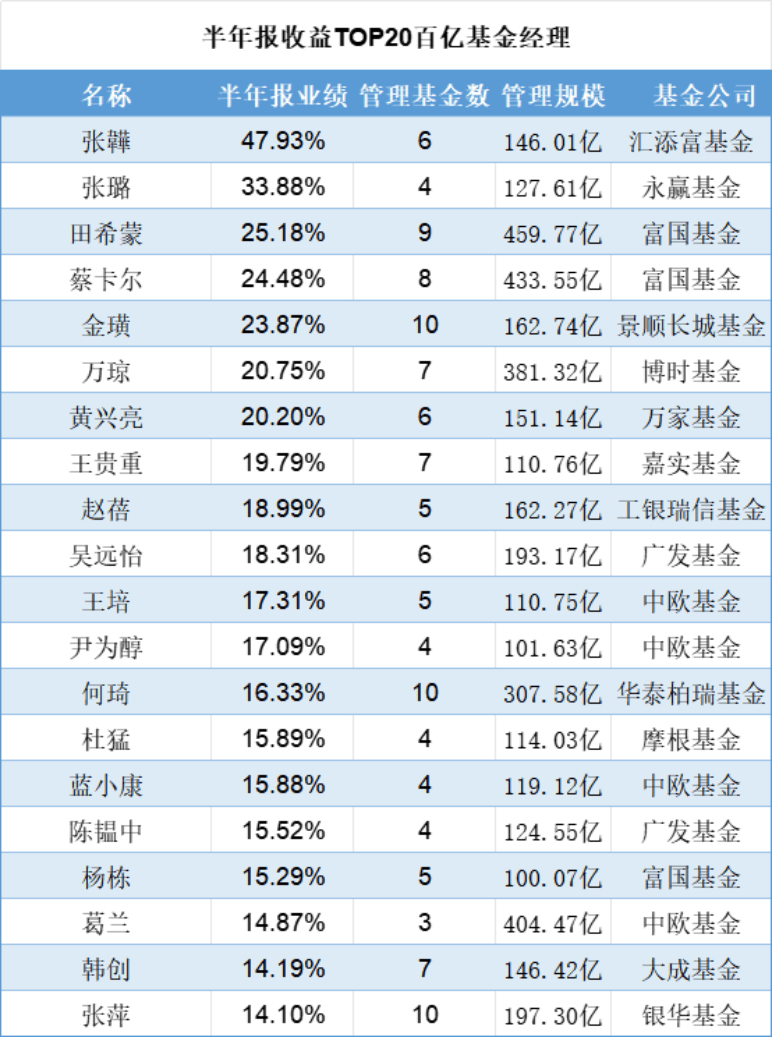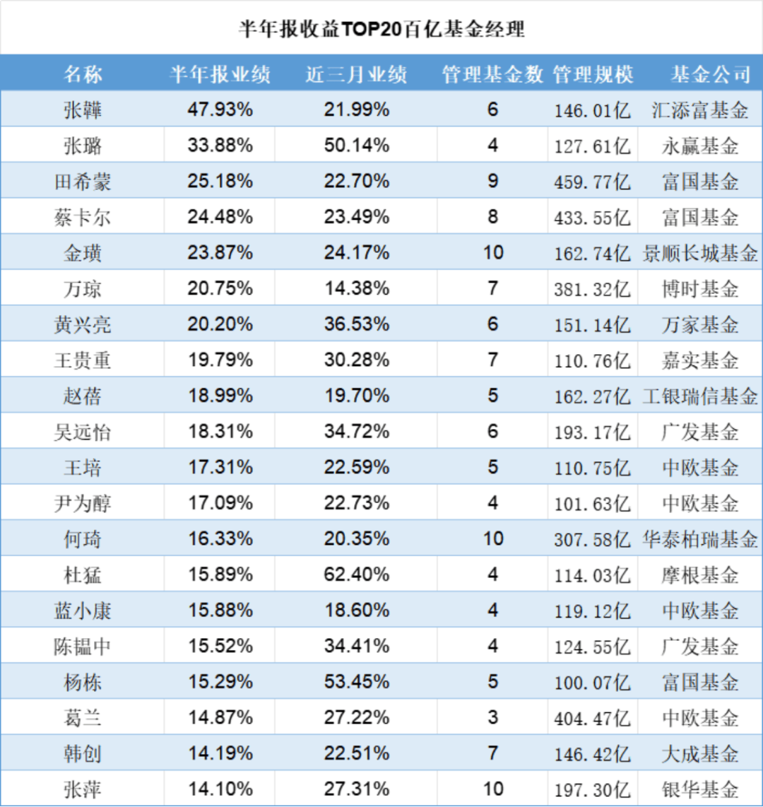 主动管理型基金方面,一批新生代基金经理上半年表现亮眼。汇添富基金的张韡成为最大“黑马”,其管理的基金上半年涨幅达47.9%。
