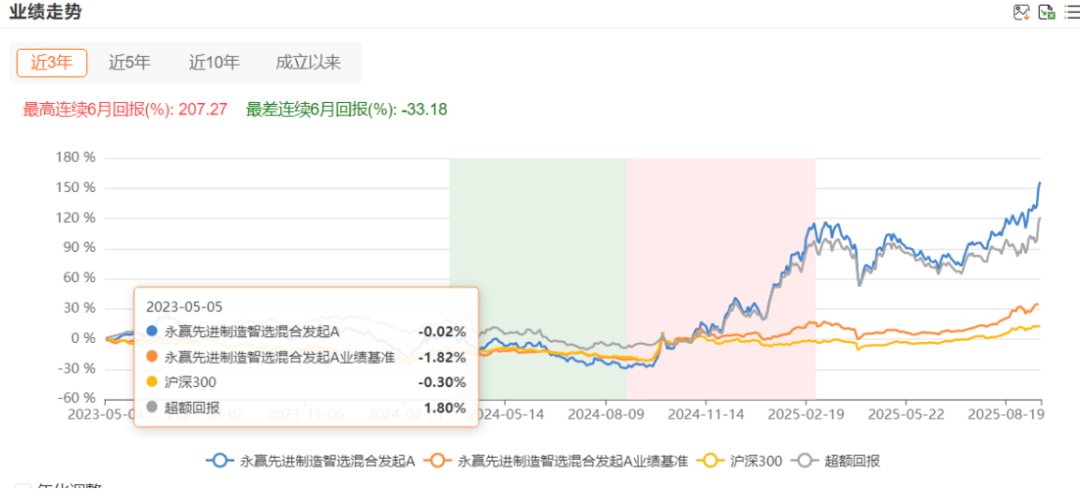以张璐的成名基金永赢先进制造智选混合发起A为例,该基金一开始也不是一帆风顺,近两年最差连续6月回报为-33.2%。