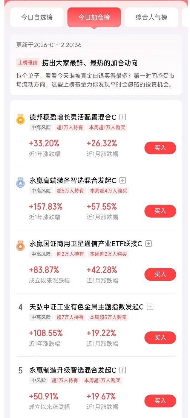 在某三方渠道的加仓榜上,德邦稳盈增长灵活配置稳居加仓榜榜首,数据显示,本周超1万人购买了该基金,1月12日为周一,本周的加仓数据也是单日;永赢高端装备智选混合位于加仓榜第二,1月12日有超过4万人购买;加仓榜第三同样来自永赢基金,其卫星ETF联接C获得超2万人购买。加仓榜前五还有天弘工业有色指数C、永赢制造升级智选混合C。加仓榜前五中,永赢占据了3个席位。