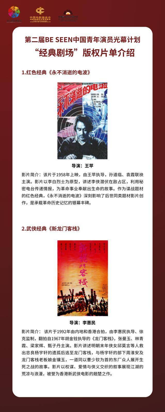 本届集训营延续BE SEEN光幕剧场厂牌,分设“经典剧场”与“实验剧场”两大板块。两个剧场均面向全球公开招募,“实验剧场”鼓励原创叙事与类型创新,“经典剧场”则基于经典影片的版权合作,鼓励立足传统、观照当代,尤其注重红色经典的当代化传承与创新转化——本届推出的版权片单由谍战经典《永不消逝的电波》与武侠名作《新龙门客栈》共同构成,参与报名的短剧(剧本)导演团队可选择一部经典影片进行短剧改编。