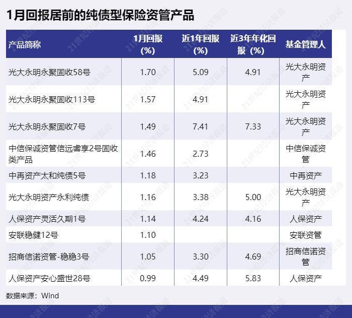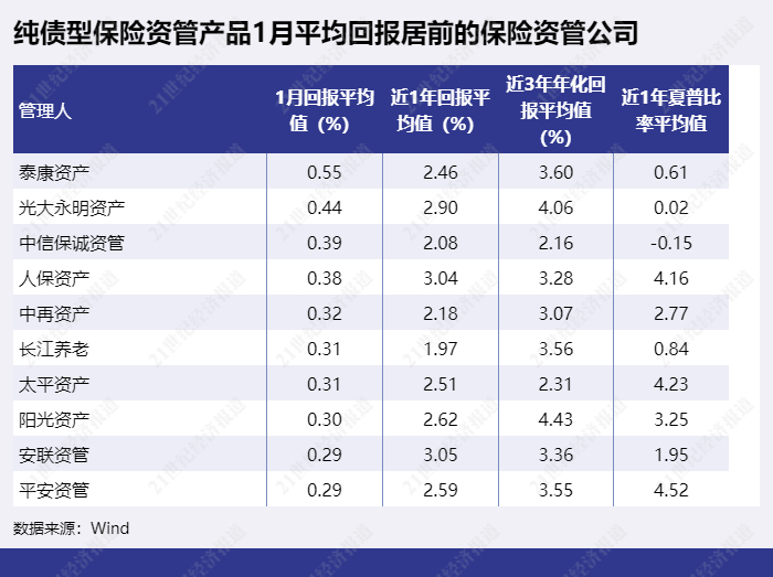 纯债型保险资管产品1月平均回报排名靠后的保险资管公司包括百年保险资管、国华兴益资管、生命资产等。