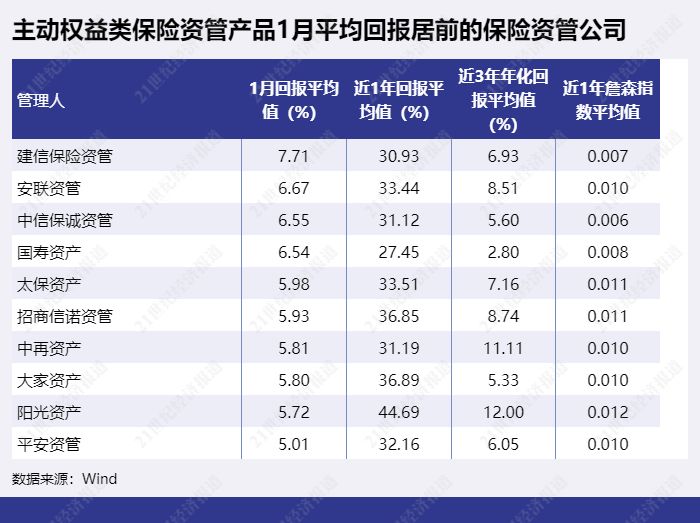 主动权益类保险资管产品1月平均回报最高的是建信保险资管,1月回报平均值为7.71%,安联资管主动权益类产品1月回报平均值6.67%排第二,中信保诚资管6.55%排第三。