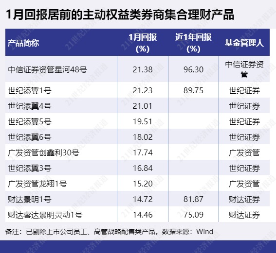 1月有3只主动权益类券商集合理财产品收益率超过21%,分别为“中信证券资管星河48号”“世纪添翼1号”“世纪添翼4号”。