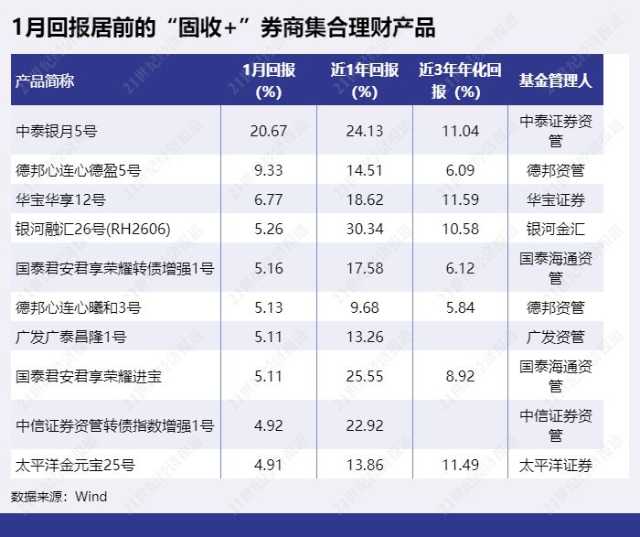 1月收益表现最突出的“固收+”券商集合理财产品为“中泰银月5号”,1月回报达20.67%。据该产品去年7月修订的资产管理合同披露,该产品主要投资债权类资产,并择机配置优质公募基金、期货、衍生品构建投资组合。