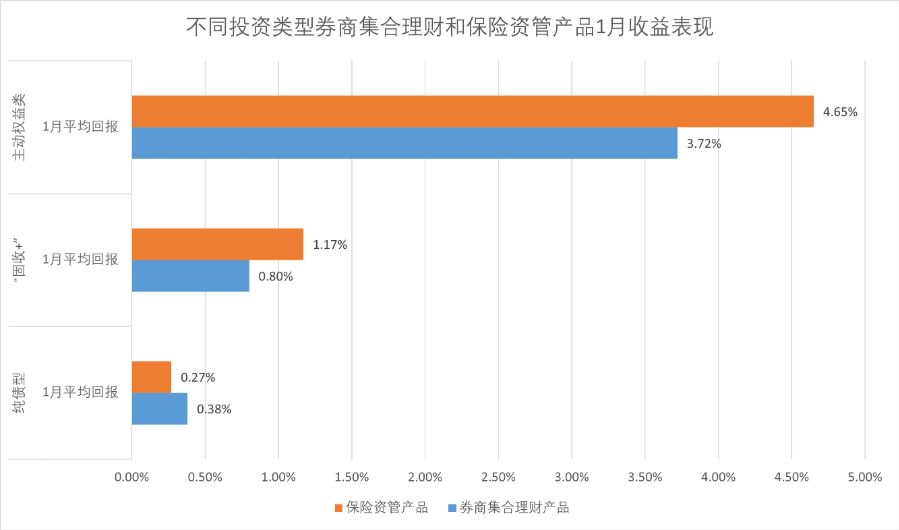 主动权益类产品受益股市表现更为强势,主动权益类保险资管产品1月已实现4.65%的平均回报,主动权益类券商集合理财产品1月平均回报也达到3.72%。