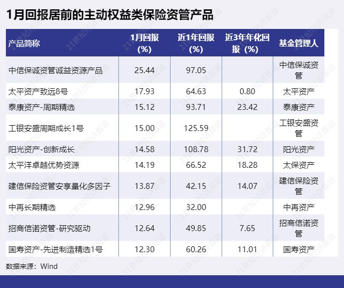 主动权益类保险资管产品中,1月回报最高的是“中信保诚资管诚益资源产品”,已实现25.44%的回报。“太平资产致远8号”排第二,1月回报为17.93%。“泰康资产-周期精选”以15.12%的回报排第三。