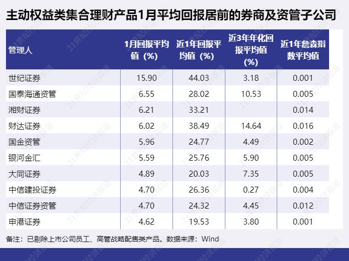 世纪证券在天翼系列多只产品1月回报超15%的加持下,主动权益类集合理财产品1月平均回报达15.9%,在券商及资管子公司中排第一。