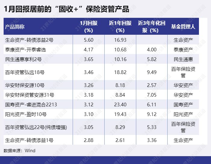 “固收+”保险资管产品中,1月回报排第一的是“生命资产-转债添益2号”,已实现5.6%的收益率。“泰康资产-开泰睿选”排第二,1月回报为4.17%,“民生通惠享利2号”以3.65%的收益率排第三。