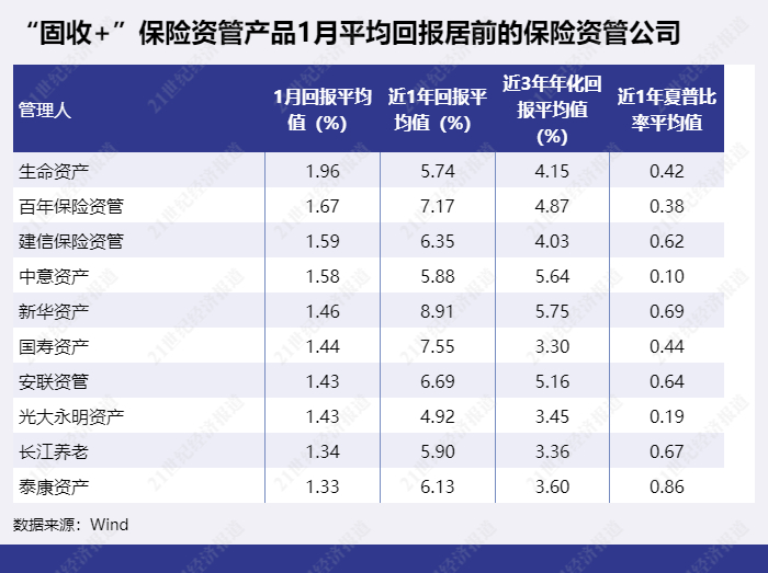 “固收+”保险资管产品1月回报平均值最高的保险资管公司为生命资产,1月平均回报为1.96%,百年保险资管以1.67%排第二,建信保险资管以1.59%排第三。